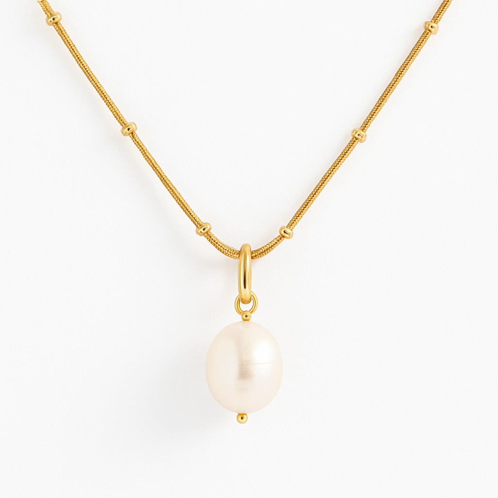The chain’s fine bead accents add a subtle texture that catches the light beautifully, while the organic pearl drop ensures every necklace is truly one of a kind. Hypoallergenic, tarnish-resistant, and crafted with sustainable PVD plating, it’s made to be worn daily and cherished for years.